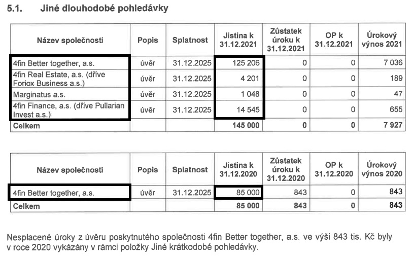 Na druhé straně měla firma 2,559 mld. korun dluhů, z nichž 1,062 mld. korun bylo splatných do 1 roku a přibližně 1,5 mld. bylo s delší splatností. Jen tato firma měla na konci roku 2021 nesplacených dluhopisů asi za 824 milionů korun. A to skrze celkem 76 dluhopisových emisí – tato firma ovšem nemá dluhopisový prospekt schválený ČNB. 674 milionů dlužila na krátkodobých směnkách a 919 milionů na dlouhodobých směnkách. Vlastní kapitál je tvořen primárně základním kapitálem o výši 449 milionů korun. Ten byl meziročně v roce 2021 navýšen o 170 milionů.