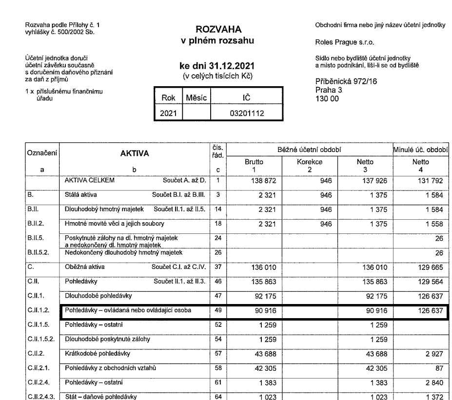 Stojí mimo skupinu RSBC Holding. RSBC Capital má posunutý účetní rok a poslední finanční výkazy zveřejněné jen k datu 31.3.2021. V té době měla záporný vlastní kapitál 17,5 milionu korun při bilanční sumě cca 492 milionů. Víme, že přes 230 milionů v majetku tvořila pohledávka za RSBC Private Equity na konci roku 2020. Ke stejnému datu měla firma pohledávku i za RSBC Holding ve výši 55 milionů. Ovšem k datu 31.3.2021 už to bylo jinak. 170 milionů byla pohledávka za RSBC Private Equity, 107 milionů za RSBC Defence, 27 milionů za RSBC Advisory a 117 milionů za společností Roles Prague, kterou vlastní Robert Schönfeld napřímo. A to začíná být opravdu zajímavé. Protože Roles Prague měla 91 milionů korun pohledávku z titulu „ovládaná či ovládající osoba“ na konci roku 2021. Což zhruba naznačuje, kdo si peníze z této firmy půjčil vzhledem k tomu, že firma neměla žádné obchodní podíly. Tak se logicky nabízí ovládající osoba.