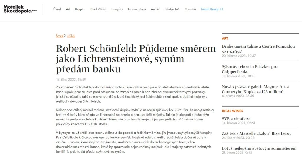 Ústřední postavou celého dokumentu na ČT je Schönfeldův již nežijící dědeček, jehož útrapy od komunistů rozhodně nemáme v úmyslu zlehčovat ani zpochybňovat. Ovšem zůstává v dokumentu naprosto zřejmá pachuť demonstrace kompetencí Roberta Schönfelda v oblasti správy majetku a demonstrace jeho bohatství. Vůbec by nás podobný dokument nezneklidňoval, kdyby Robert Schönfeld nebyl osobou s rozsáhlými aktivitami v oblasti finančnictví, při kterých získává pod svou moc značné finanční prostředky cizích lidí. A kdyby aktivně svůj rodový příběh a příslušnost k bývalé aristorikracii nepoužíval v rámci PR strategie na investory. Díl dokumentárního seriálu Modrá krev, ve kterém hraje dominantní roli Robert Schönfeld, navazuje na videorozhovor Petra Skočdopoleho, ve kterém je sdělení v zásadě stejné. To sdělení zní v zásadě „jsem kvalifikován pro správu majetku“ díky tomu, z jakého rodu pocházím. Tam se dokonce nebál přirovnat svůj rod k bankéřskému klanu Hanse Adama II z Lichtenštejnska, jenž ovládá významnou banku LGT a finanční systém v Lichtenštejnsku. Kdo jen trochu chápe význam lichtenštejnského podnikatelského klanu, jenž je zároveň vlastníkem neuvěřitelně rozsáhlého majetku pozemků i uměleckých děl, firem a hlavou státu Lichtenštejnského knížectví, ví, jak takové přirovnání je absolutně nesmyslné a zcestné. Mimochodem banka patřící lichtenštejnskému Fürstovi měla v roce 2021 vlastní kapitál přes 6 mld. franků při bilanční sumě 52 mld. franků.