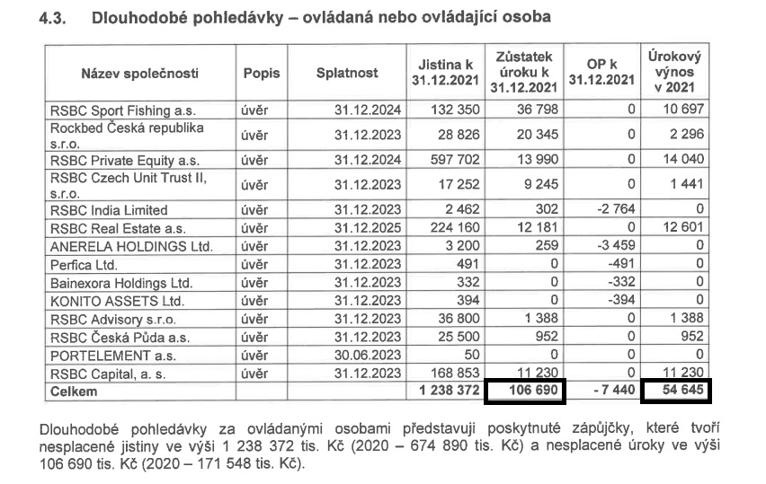 Takže si shrneme RSBC Capital. Nevím, co vše jí bylo splaceno v roce 2021. Ale víme, že na konci roku 2020 držela prakticky pouze pohledávky za výše uvedenými skupinami a nepřímo pak přes Roles Prague za Robertem Schönfeldem.